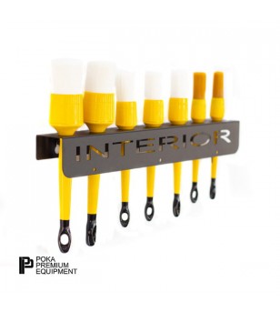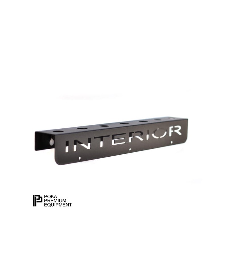 Funcional portabrochas y accesorios para el cuidado del auto con inscripción "INTERIOR" cortada con láser. Los orificios superiores se adaptan a la mayoría de los tamaños de brochas del mercado.