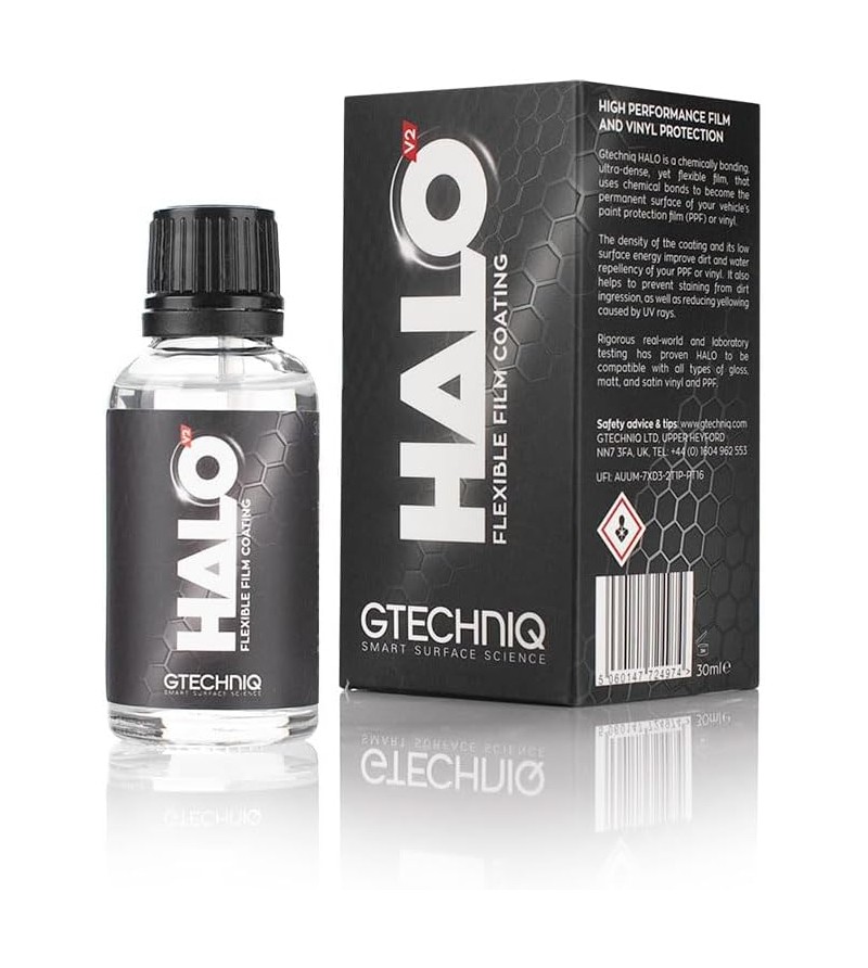 HALO mejora el rendimiento de la película protectora de pintura (PPF) y el vinil. Es una película flexible ultradensa que se une químicamente y se convierte en la superficie permanente de la película, protegiéndola de los elementos que enfrenta un automóvil a diario.