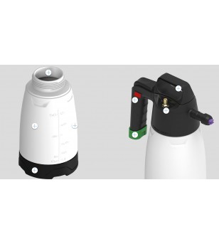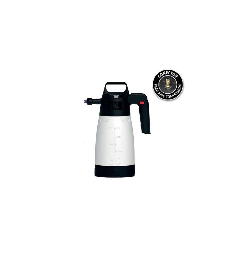 La espumadora IK Foam Pro 2+ incluye un conector de aire comprimido; una válvula de entrada que está situada en la parte superior del pulverizador y permite la inserción de aire al depósito gracias a la válvula universal de Schrader que es apta para compresores a nivel mundial.